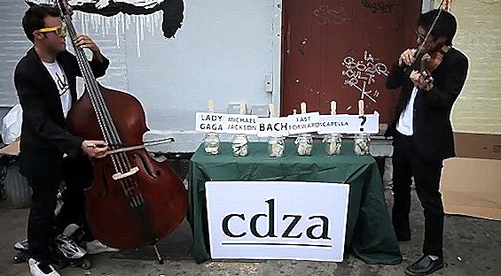 Тие креираа џубокс на којшто минувачите оставајќи паричка во една од теглите, можеа да изберат песна од Лејди Гага, Бах и Мајкл Џексон, свирење брзо, свирење споро и изненадување. Изведувачите на виолина и на контрабас умешно им ја исполнуваа секоја нивна желба, а сумирано на крајот и заработија некој долар.