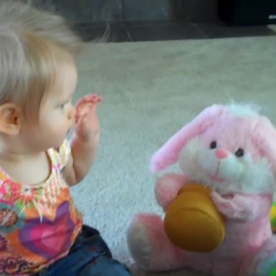 Погледнете ја танцовата битка помеѓу ова бебенце и неговото велигденско зајаче