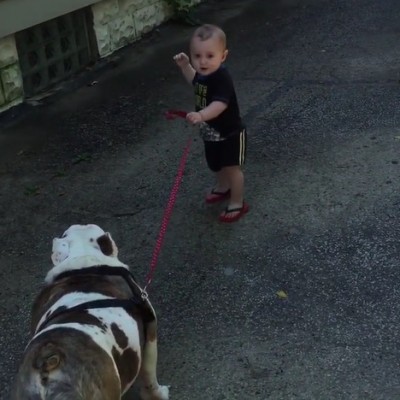 Погледнете како ова 11-месечно детенце се обидува да го шета својот мрзлив булдог