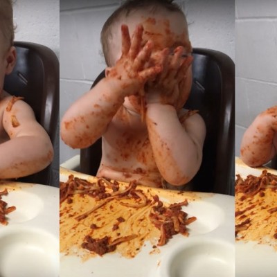 Бебе јаде шпагети додека заспива