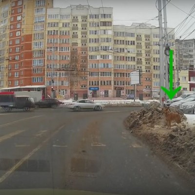 Куче чека зелено светло на семафорот за да ја помине улицата