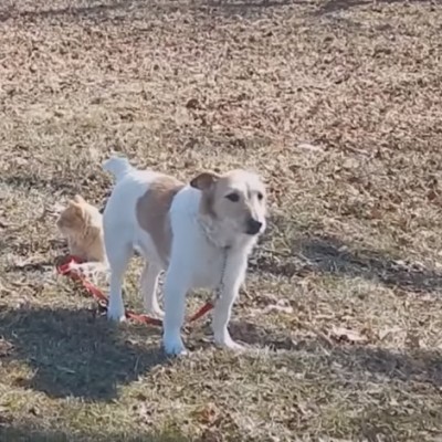 Доминантна мачка не сака да го пушти ова куче од ланец