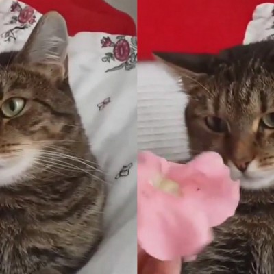 Оваа мачка прави бесценет израз откако ќе биде „поразена“ од цвет