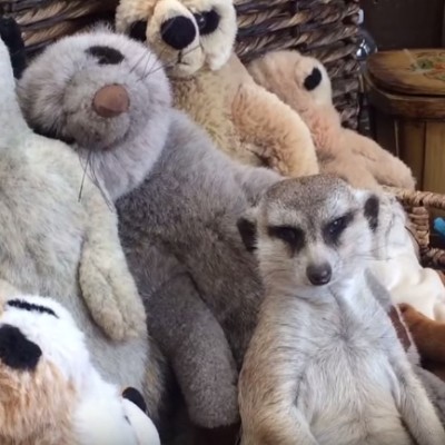 Поспан меркат се обидува да не заспие во кошница со плишани играчки