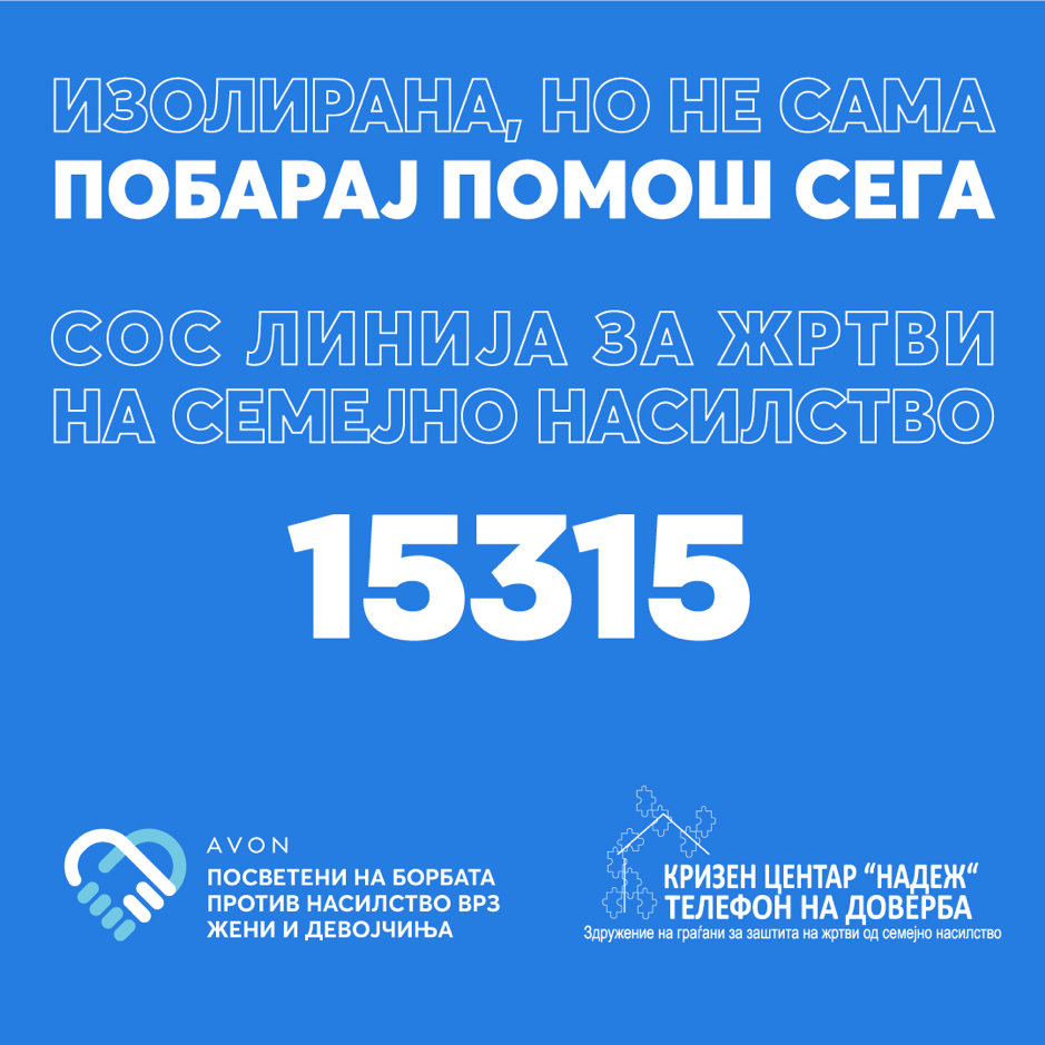 Веќе 15 години, AVON ги поддржува организациите кои се борат против семејно насилство и потребата од поддршка не била никогаш попотребна. Горди сме што можеме да придонесеме и да ја поддржиме кампањата на AVON, #ИзолиранаНоНеСама за да одговориме на порастот на насилството предизвикан од пандемијата со корона вирусот.“