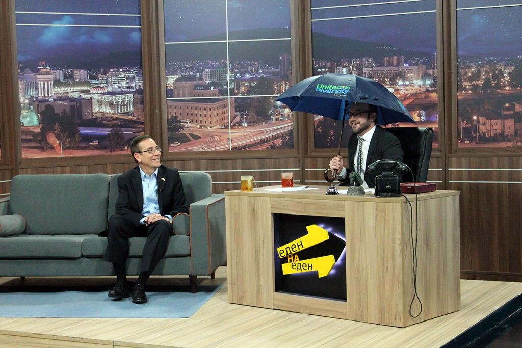 Позади камерите амбасадорот Бејли оствари и „дипломатска“ средба со министерот за Надворешни работи на Република Македонија, господинот Никола Димитров кого ќе го видите во следното издание на „Еден на Еден“ на 26-ти ноември.