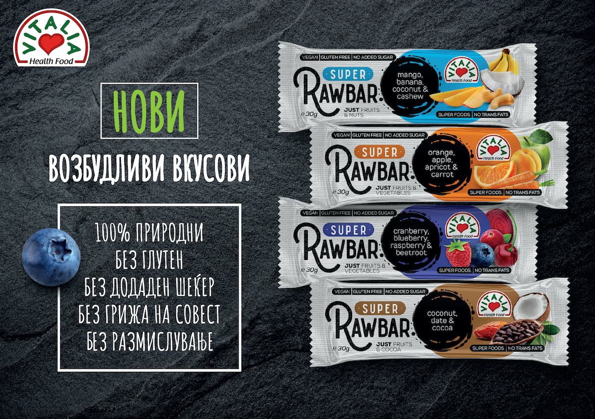 Во чекор со овој тренд, пронајдете ги четирите нови вкусови на Виталиа сировите барови на база на овошје и зеленчук кои ги задржуваат оригиналните хранливи материи и минерали, додека вкусот на состојките останува со истиот интензитет. Овие ужинки се ослободени од какви било преработени состојки и наместо тоа содржат висок процент на суво овошје, зеленчук и интегрални житарки. Настрана од тоа, се карактеризираат со сладок вкус добиен од изобилството на овошје, без додадени шеќери, без глутенски состав, и совршено се вклопуваат во вегански режим на исхрана.
