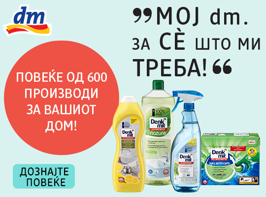 Брендот со долга традиција и ,,главната ѕвезда’’ за чистење од dm дрогериите, Denkmit, опфаќа производи за перење и нега на алишта и отстранување на дамки, специјални средства за чистење на домаќинството, иновативни освежувачи за простории и фрижидер, како и парфеми за алишта. Овој симбол за високоефикасни средства за перење, чистење и бришење, покрај многу поволните цени, го карактеризираат и највисоките стандарди за производство. Покрај тоа, реномираните марки кои може да ги пронајдете во dm дрогериите, како што се Cillit Bang, Frosch, Cif и многу други, ќе ви овозможат да ги засакате домашните активности, па дури и чистењето на најпроблематичните предели во вашето домаќинство.