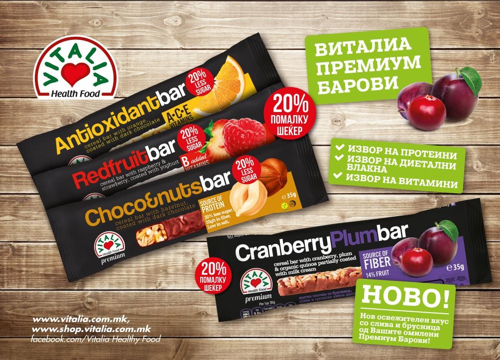 Таа совршена комбинација на чоколадо и житарки ја има во житните плочки и муслите на Виталиа. Па така следниот пат кога ќе почувствуваш неконтролирана желба за нешто благо, слободно можеш да посегнеш по премиум баровите или безглутенските мусли и барови на Виталиа, баровите од серијата Go nutri, Biters 2 Go или V for Vitality. Така ќе го скротиш „змејот“ во стомакот, но и ќе се снабдиш со доволно енергија и добро расположение. И што е најважно ќе грицкаш без грижа на совест.