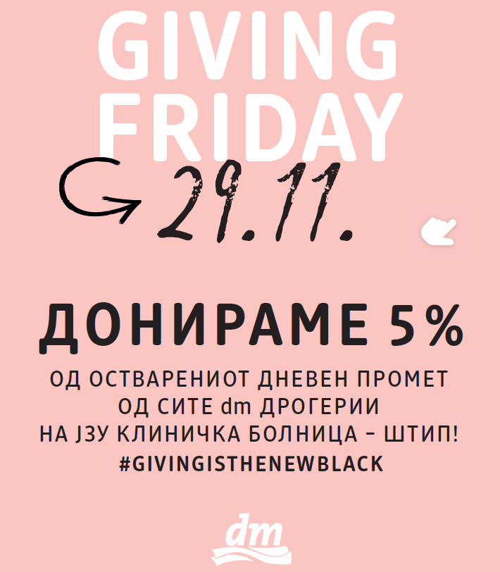Поинаков black friday: dm за првпат организира giving friday! Под мотото #givingisthenewblack, донира 5% од остварениот промет на тој ден во хуманитарни цели!