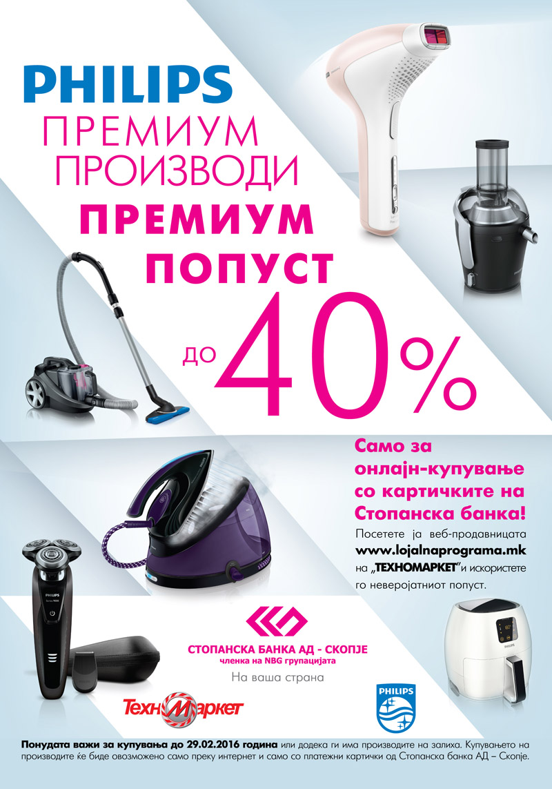 Во оваа веб-продавница ќе можат да пазаруваат само клиентите со платежни картички на Стопанска банка на кои ќе им биде овозможено да набавуваат премиум производи на Philips по ексклузивни цени со попуст до 40%.