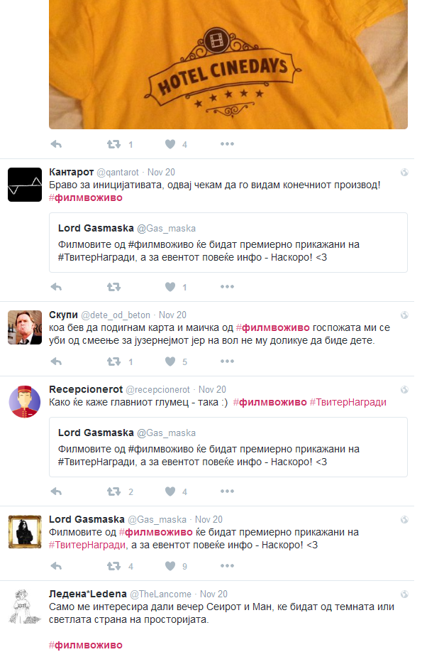 Ова е прва голема Твитер-кампања што се одвива во Македонија и не само што беше одлично прифатена од сите, туку и ја постигна својата крајна цел – разбуди поголем интерес за филмскиот фестивал „Синедејс“ во чии рамки се одвиваше.
