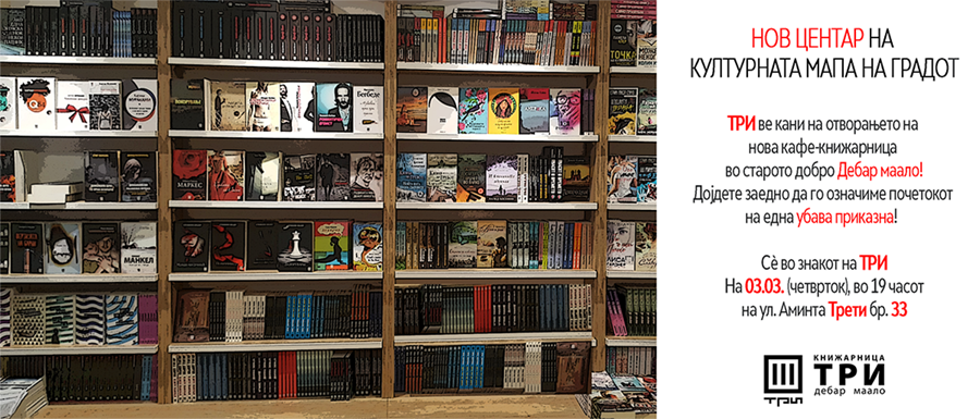 Издавачкиот центар ТРИ, на 3 март, четврток, во 19 часот, ќе ја отвори својата нова кафе-книжарница во Скопје, на улицата Аминта Трети (Ленинова) во Дебар маало.