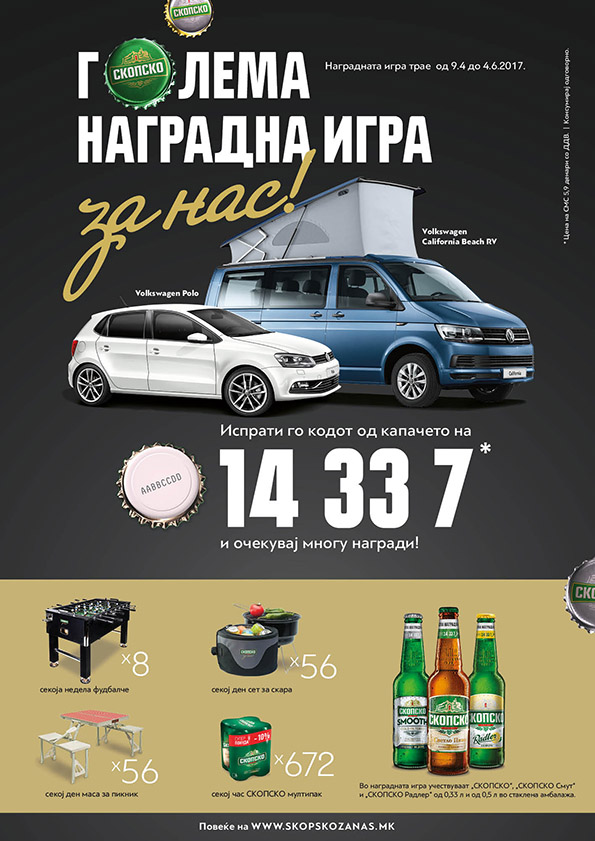 Уживајте во секое испиено СКОПСКО во стаклена амбалажа, испраќајте СМС на 14 33 7 и можеби токму вие ќе бидете добитникот на VW Polo или VW California Beach RV, камперско возило кое ви донесе многу авантура во животот.