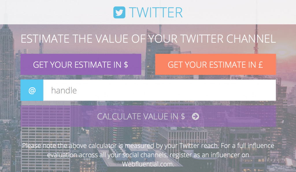 Според Webfluential, креаторите на калкулаторот за пресметка на вашата вредност, сè што треба е да го внесете вашето корисничко име во пресметувачот. „Од тука натаму, ние пресметуваме колку пари би можеле да заработувате по твит и со тоа сонот да бидете социјално влијателни (и да сте платени за тоа) би можел да стане реалност.“