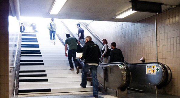 Психолошкиот експеримент кој сакал да докаже дека може да ги промени навиките на луѓето (на подобро) со тоа што секојдневните досадни навики ќе ги претвори во забава, се покажал како многу успешен. Во 2009 година во Стокхолм, Шведска група работници преку ноќ ги претвориле скалите во една подземна железница, во потполно функционален клавир. Секој пат кога некој минувач ќе застанел на одредена скала таа ја свирела таа нота. Тој ден, 66% од минувачите ги избрале пијано скалите наместо ескалаторот.