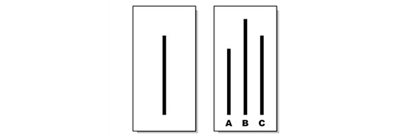 Во овој експеримент на испитаниците им е дадена една линија, а потоа барале да ја споредат со останатите три и да ја погодат точната големина. Се гледа едноставно, зар не? Сепак, поголем дел од испитаниците одбрале погрешна линија. Тоа е последица на тоа што во собата каде што бил сместен испитаникот биле поставени глумци кои кажале погрешен одговор.