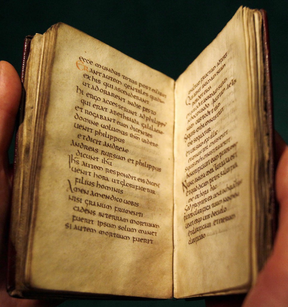 Најстарата книга која сè уште е во одлична состојба е евангелието на Св. Кутберт. Овој текст бил напишан на латински во 7-иот век. Оваа книга е копија на евангелието на Св. Јован, оригинално напишано во североисточна Англија за Св. Кутберт и била поставена во неговиот ковчег пред повеќе од 1.300 години. Кога Викинзите го нападнале североисточниот брег на Англија, монасите го напуштиле островот и го земале ковчегот со нив, на тој начин зачувувајќи ја книгата. Ковчегот бил отворен во 1104 година кога бил граден нов олтар за светецот.