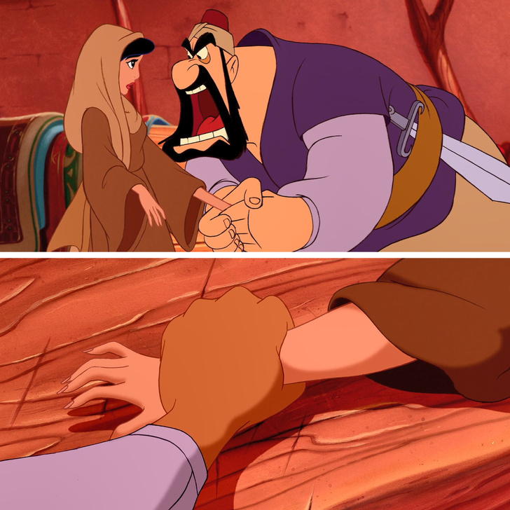 12. Во „Аладин“, кога Јасмин ќе украде јаболко, продавачот ја фаќа за раката и ѝ ја става на масата. На масата има гребнатини што покажуваат дека тој отсекол многу раце за кражба на овошје
