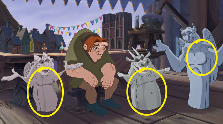 5. Во „Ѕвонарот на Богородичната црква во Париз“, скулптурите од олуците имаат дамки од вода на нив