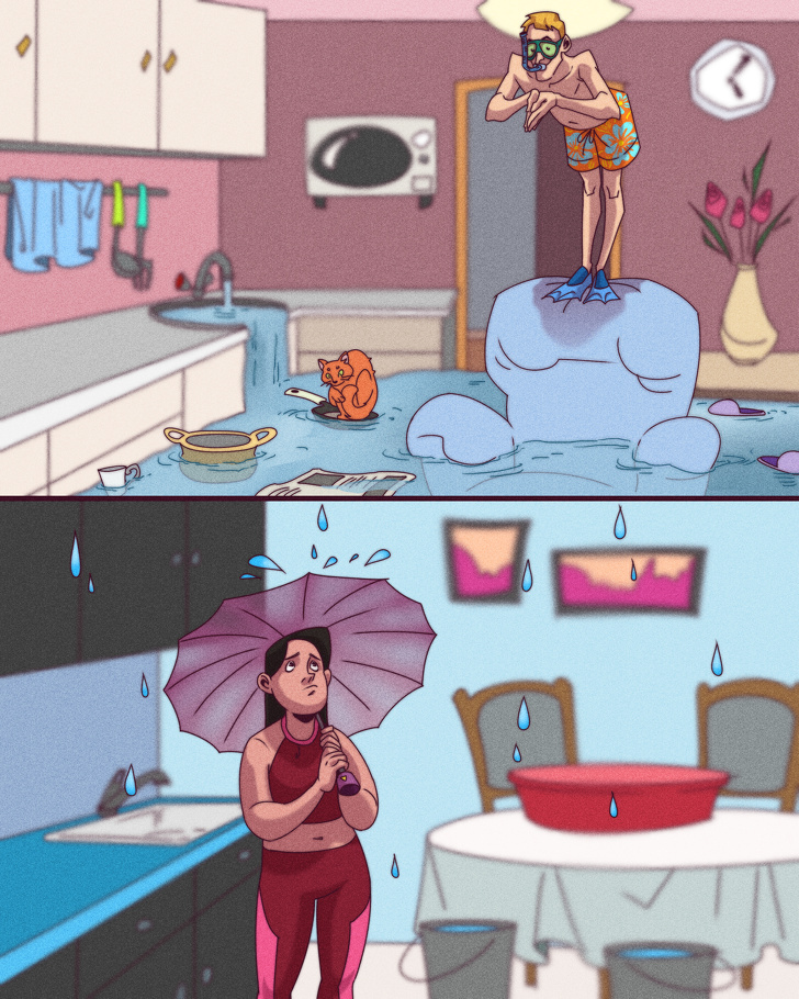 Соседот чија санитарна инсталација постојано има проблем, и секогаш овој факт е усклучително неочекуван за него. После сите извинувања, тој им обезбедува на соседите под него уште едно протекување.