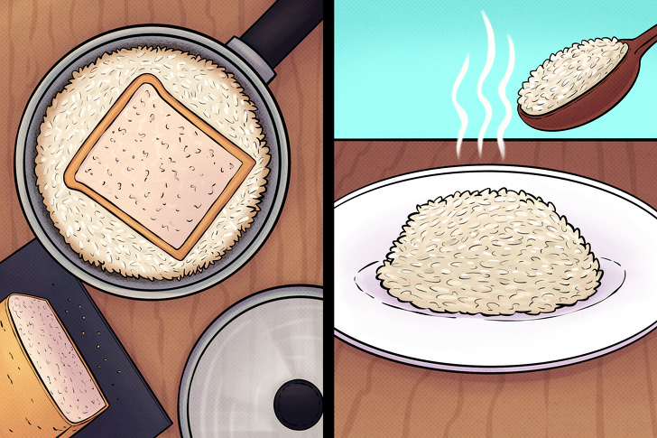 Немојте да го фрлате оризот, иако е изгорен. Најпрво ослободете се од проблематичниот дел и потоа врз остатокот ставете парче леб за да го отстрани мирисот. Никој нема да забележи!