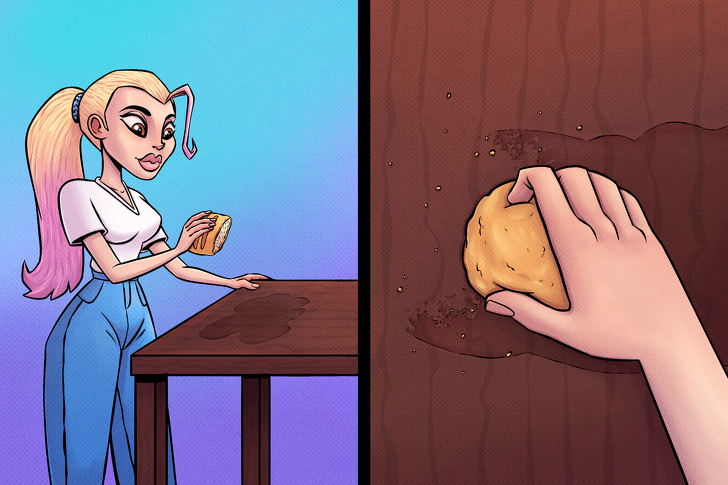 Волнената ткаенина ќе ви помогне да ги соберете ситните парчиња стакло од скршената чаша, а и лебот има слична текстура. Користете го мекиот дел од лебот како памучна топка и исчистете го местото каде се скршило стакло со поминување преку површината.