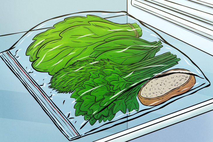 Воздухот, исто така, влијае и на вашиот лиснат зеленчук, дури и кога тој стои во фрижидер. Ставете парче леб во садот во кој го чувате зеленчукот. Ова ќе помогне тој да не се расипе брзо, а го елиминира и мирисот на скапано.