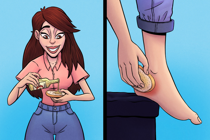 Кога станува збор за природен третман на стапалата, комбинација од јаболков оцет и леб може да направи чуда. Киселите својства на оцетот помагаат за навлажнување на исушена и испукана кожа. Додека пак, порозната структура на лебот ќе остане влажна подолго во споредба со памук или обичната крпа. Оставете ја смесата преку ноќ и покријте ги стапалата со пластични кеси и чорапи. Ќе се разбудите со помека кожа на стапалата, особено на вашите пети.