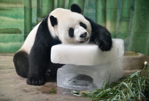 Големата панда Веи Веи се одмара на парче мраз во зоолошката градина Вухан во Кина