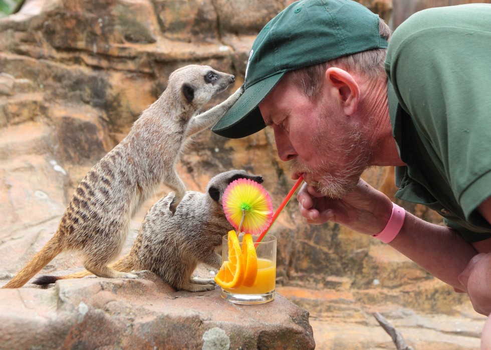 Меркати и чувар на зоолошка споделуваат сок од портокал во Ексмор Зоо во Велика Британија