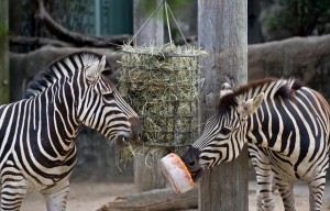 Зебри јадат замрзнати моркови во зоолошката градина Таронга, Сиднеј