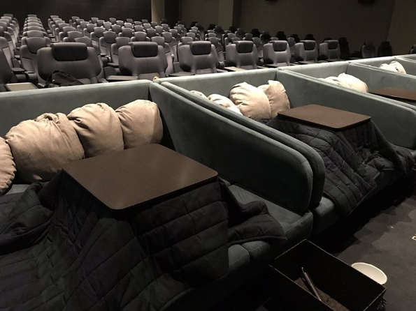 Дури и во киносалите во Јапонија, удобноста на посетителите е на врвно ниво. Во градот Токоразава, неодамна се отворило кино, во коешто ќе се почувствувате како да гледате филм во домашна атмосфера, благодарение на масите „kotatsu“, под коишто има греајчи, коишто ќе ве топлат во студените денови.
