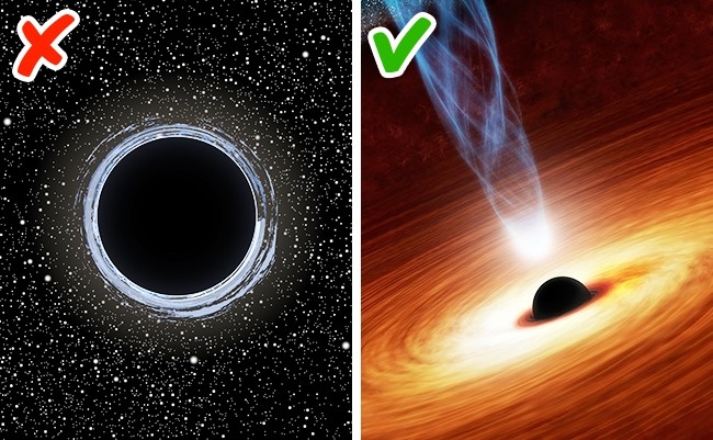 Вистинската црна дупка наликува на топка. Всушност, нема никаква „дупка“ која привлекува нешто внатре. Тоа е само небесно тело со толку силна гравитација што ни светлината не може да избега од него – затоа и е црно.