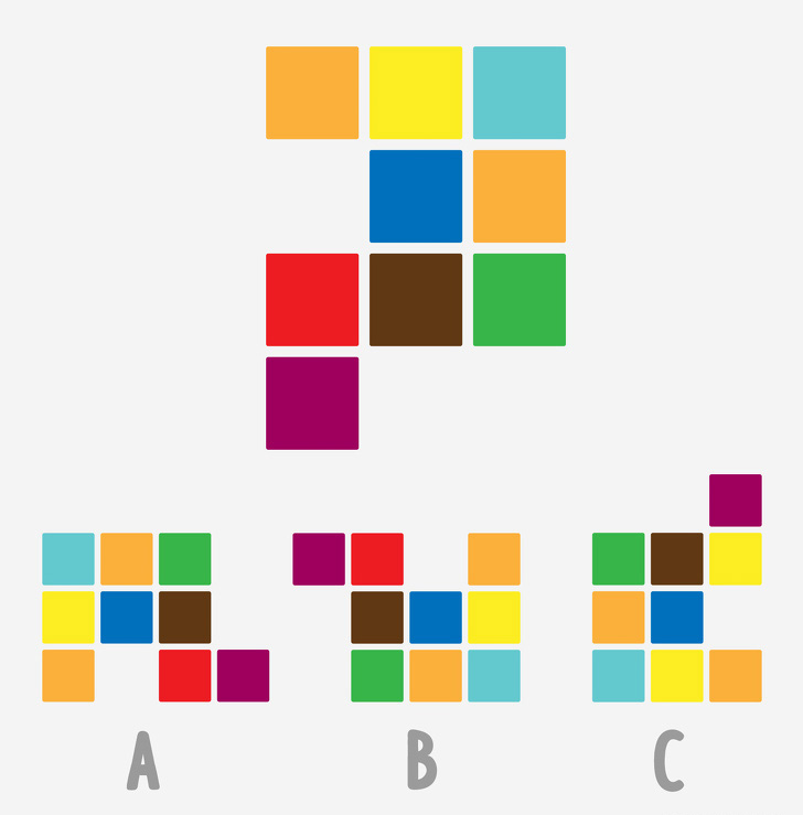 Ако ги свртите фигурите сите изгледаат како дадениот пример. Но, фигурата под С го нема црвениот квадрат.