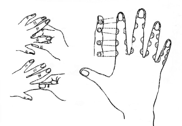 Масажите за секој прст се прикажани на горната слика. Секоја масажа треба да се состои од 3-10 притисоци во должина на прстите, а потоа и во ширина. Би требало да почнете со левата рака, а да завршите со прстите на десната рака.