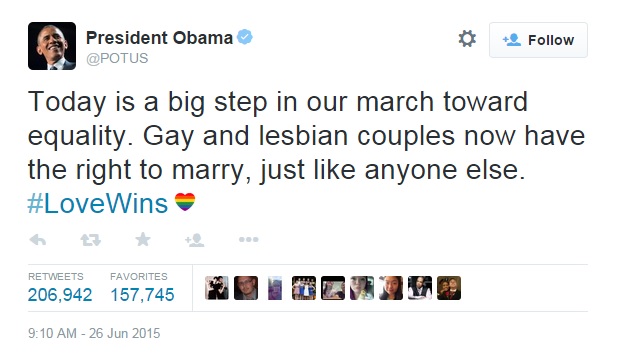 4. Кога претседателот на САД, Барак Обама, објави на Твитер дека геј браковите се дозволени во целата земја. Хаштагот #LoveWins се прошири низ сите социјални мрежи во светот.