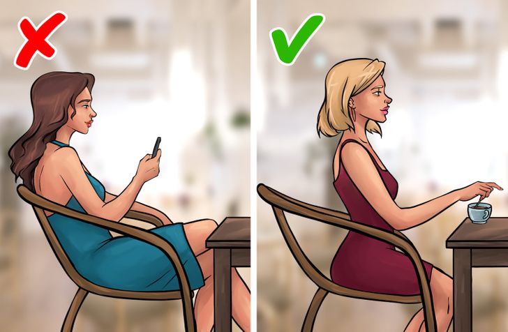 Ако една дама седи на масата, таа треба да седне на средината на столот. Многу е важно да оставите простор помеѓу столот и грбот. Оваа позиција на телото одговара на таканаречената поза на војвотка. Треба да седите исправено, но слободно, а просторот помеѓу вашето тело и работ на масата треба да биде еднаков на растојанието помеѓу зглобот и прстите. Ако цело време се потпирате на задниот дел од столот, заборавете на исправениот грб.