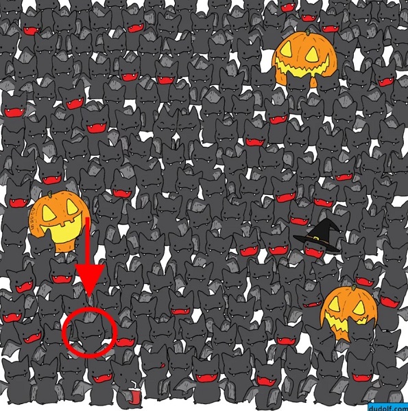 Доколку сѐ уште не ја најдовте и се откажувате, еве го решението. Мачката се наоѓа доколку броите три лилјаци од лево кон десно во редот најдолу. Мачката го допира десното уво на третиот лилјак. Изгледа како да има крилја поради двата лилјака кои се до неа, но не се залажувајте – сепак е мачка.
