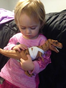 Едно девојче решило да ги преврзе раните кои биле исцртани на оваа играчка диносаурус за да му биде подобро