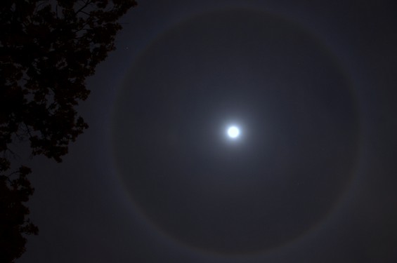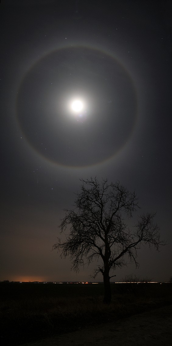 Прстенот околу месечината настанува од прекршувањето на месечевата светлина (која всушност е сончева светлина) низ ледените кристали кои се наоѓаат во горната атмосфера. Овие ледени кристали имаат шестаголна форма, па затоа секогаш ја прекршуваат светлината под ист агол. Секако, атмосферата е преполна со кристали и прекршувањето на месечевата светлина се одбива во сите насоки. Но, во еден момент може да се случи голем дел од неа да биде директно насочена кон вашите очи. И бидејќи не сте во можност да ја видите целата светлина, пред вас се формира прстен околу месечината.