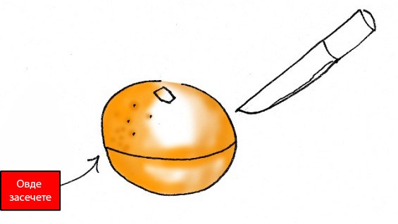 Во долниот дел од кората на мандарината каде има мало издигнување од жилите, т.н филиљ, не го отстранувајте затоа што тоа ќе ви помогне да ја запалите свеќата. Со ножето, внимателно направете мало дупче на горната кора за да може да пробива малото оганче низ лушпата.
