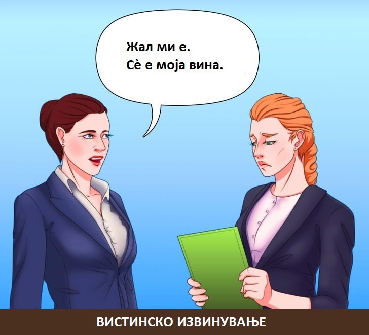 - „Жал ми е, во ред!“ – ова всушност не звучи како извинување, ниту во зборовите што ги содржи, ниту во тонот на гласот кога се изговараат.