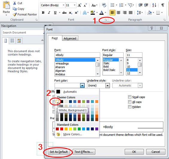 Наједноставниот трик со кој ќе го збуните вашиот колега е да ја смените бојата на фонтот во бела. На овој начин буквите нема да се читаат на мониторот. Ако вашиот колега работи на нов документ, најпрво зачувајте резервна копија од него, па потоа променете ја бојата. Тоа ќе го сторите ако кликнете на делот за менување на фонтот (Font), па ја селектирате белата боја и на крајот изберете Set as Default.