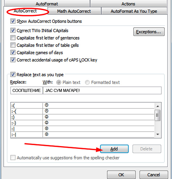 Во AutoCorrect напишете го зборот кој сакате да се претвори во некој друг. За да ви успее шегата, тоа треба да биде најчесто применуваниот збор од страна на вашиот колега. Кога конечно ќе го изберете и напишете, кликнете Add, па OK.