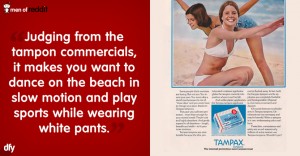 „Судејќи според рекламите за тампони, прави да сакаш да танцуваш на плажа во забавена снимка и да спортуваш додека носиш бели гаќички.“