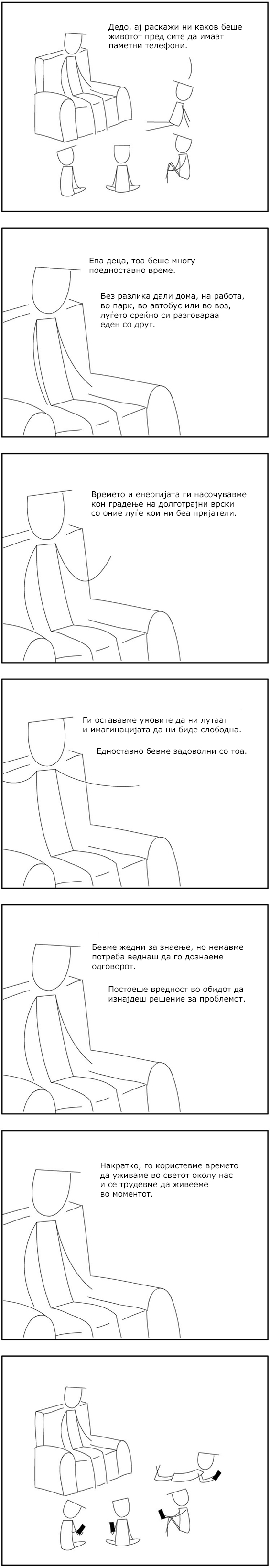 Ова интересно сатирично стрипче ни ја прикажува пустата човечка опсесија со паметните телефони, преку еден дедо кој им раскажува на своите внуци како се живеело порано, пред паметните телефони да се појават.