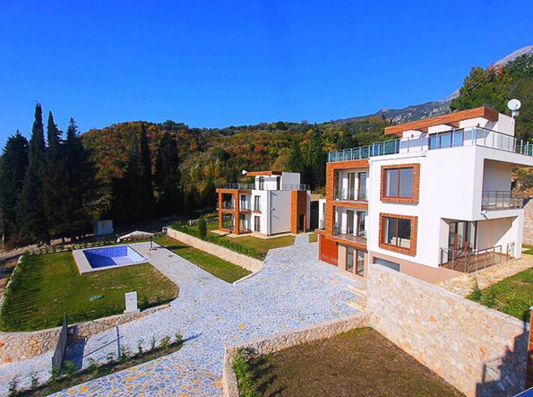 3 ката, 3 спални, 3 бањи, кујна и трпезарија, дневна соба со голема тераса и панорамски поглед, тераса на покривот, градина, базен и места за паркинг.