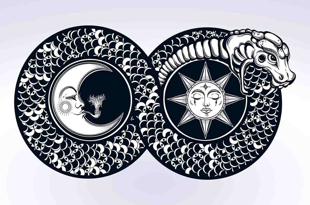 Симболот на бесконечноста претставува и уроборос, антички симбол кој прикажува змија како си ја гризе сопствената опашка. Го претставува циклусот на животот (раѓање – смрт – повторно раѓање) и произлегува од тајното учење дека ние сме обврзани да ги повторуваме нашите реинкарнации сè додека цврсто се држиме за ова Царство. Оние кои се просветлени сфаќаат дека животот нуди безброј искуства кои треба да послужат како лекции за будењето и просветлувањето. Откако ќе се разбудиме ќе го прекинеме кругот на бесконечни инкарнации, токму како што учат древните религии како хиндуизмот и будизмот.