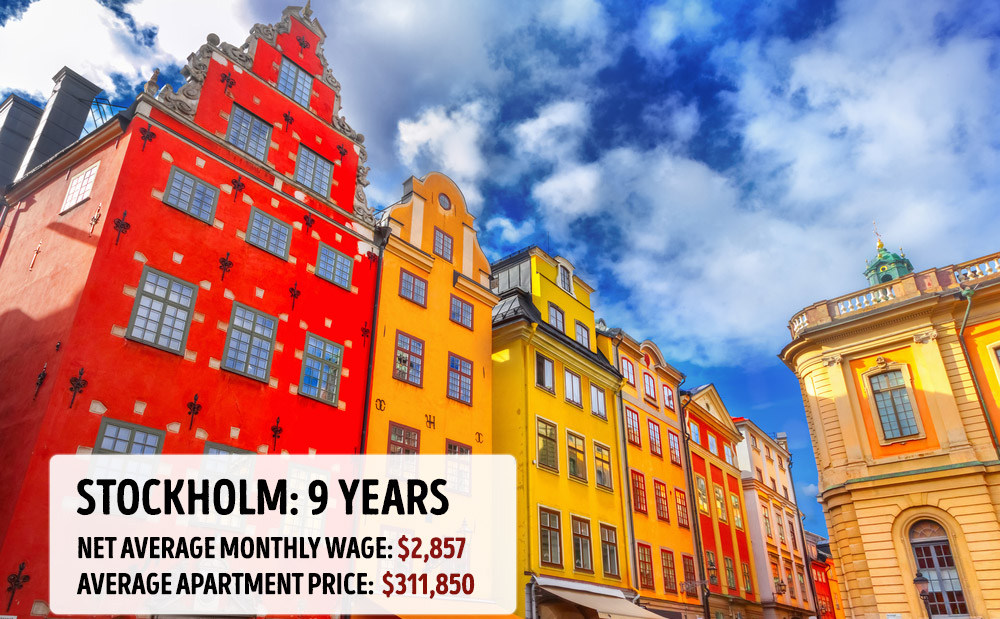 Стокхолм: 9 години. Просечна месечна плата: 2.857 долари. Просечна вредност на стан: 31.850 долари.